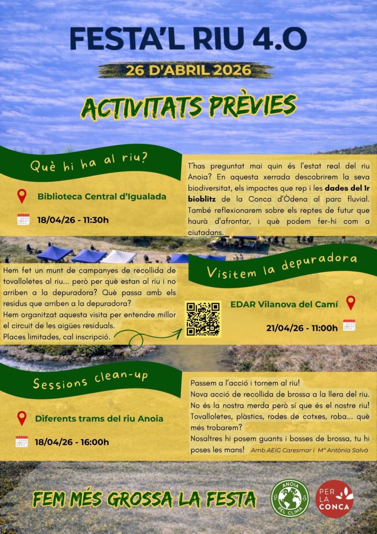 Per aquest motiu, el 26 d’abril de 2026 celebrem la 4a edició de la Festa’l Riu, una jornada que vol apropar el riu Anoia a la ciutadania d’Igualada, Santa Margarida de Montbui i Vilanova del Camí, generar estima pel seu entorn i reivindicar accions concretes per a la seva recuperació. La festa combina activitats educatives, lúdiques i participatives que conviden a aprendre, gaudir i actuar, convertint el riu en protagonista d’un projecte col·lectiu de futur.