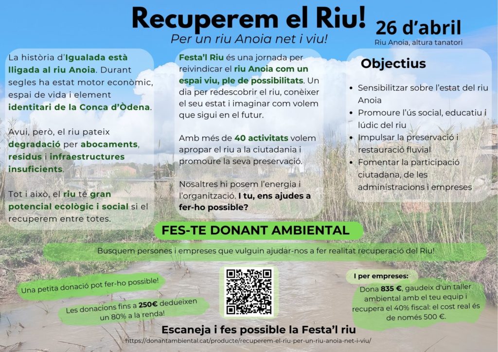A partir del següent enllaç podràs col·laborar amb l’organització de la Festa’l Riu: donantambiental.cat/producte/recuperem-el-riu-per-un-riu-anoia-net-i-viu/